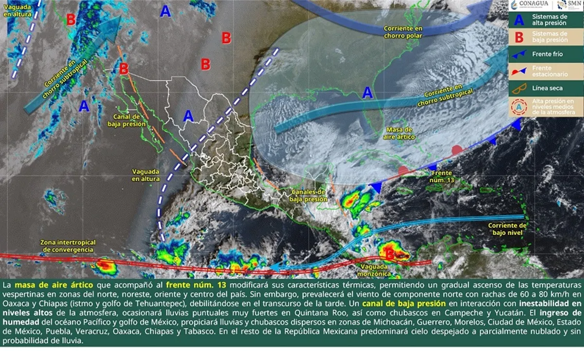 La cronología establecida por los servicios meteorológicos prevé que la masa de aire asociada al frente frío 13 aún modifique gradualmente las condiciones del clima durante el miércoles 12, mientras el nuevo frente se aproxima hacia el noroeste.