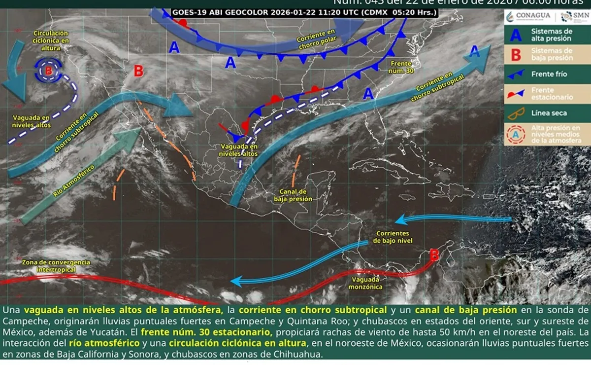 El próximo viernes 23 de enero, el frente frío número 30 se aproximará al noreste de México, desplazándose lentamente, desde el sábado hasta el martes, sobre el noreste, oriente y sureste de México, así como la península de Yucatán.