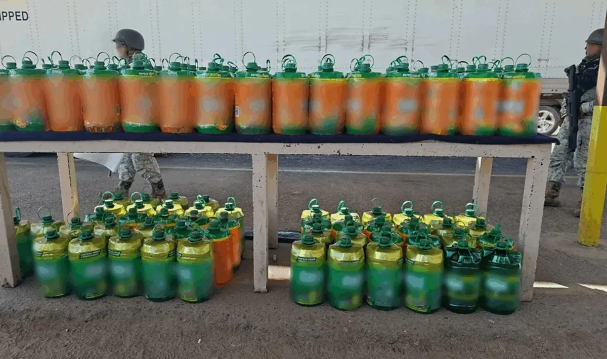 Agentes de la Guardia Nacional (GN) decomisaron mil 67 litros de metanfetamina líquida oculta en bidones de limpiador multiusos, durante un operativo de seguridad en el estado de Sonora.